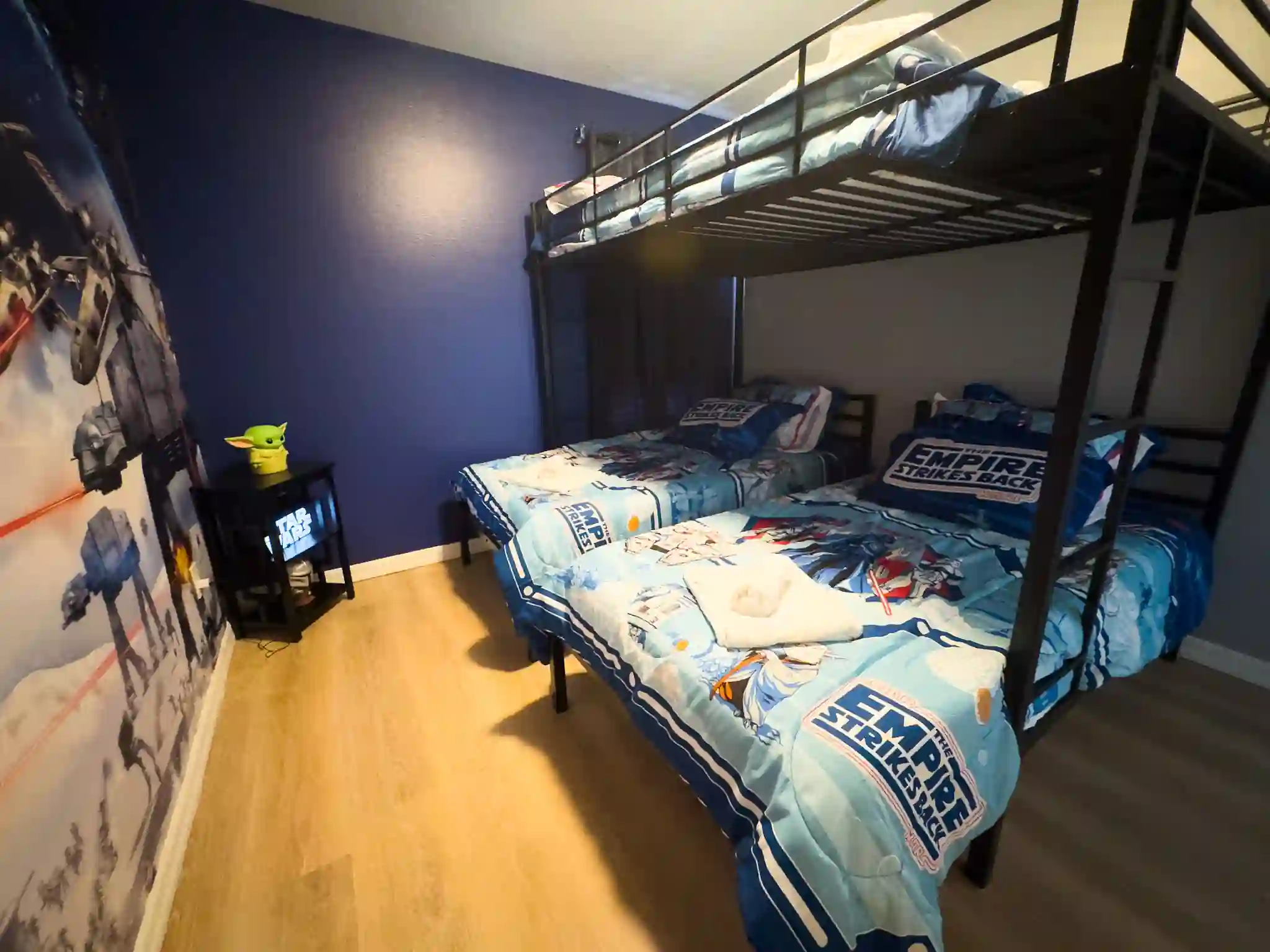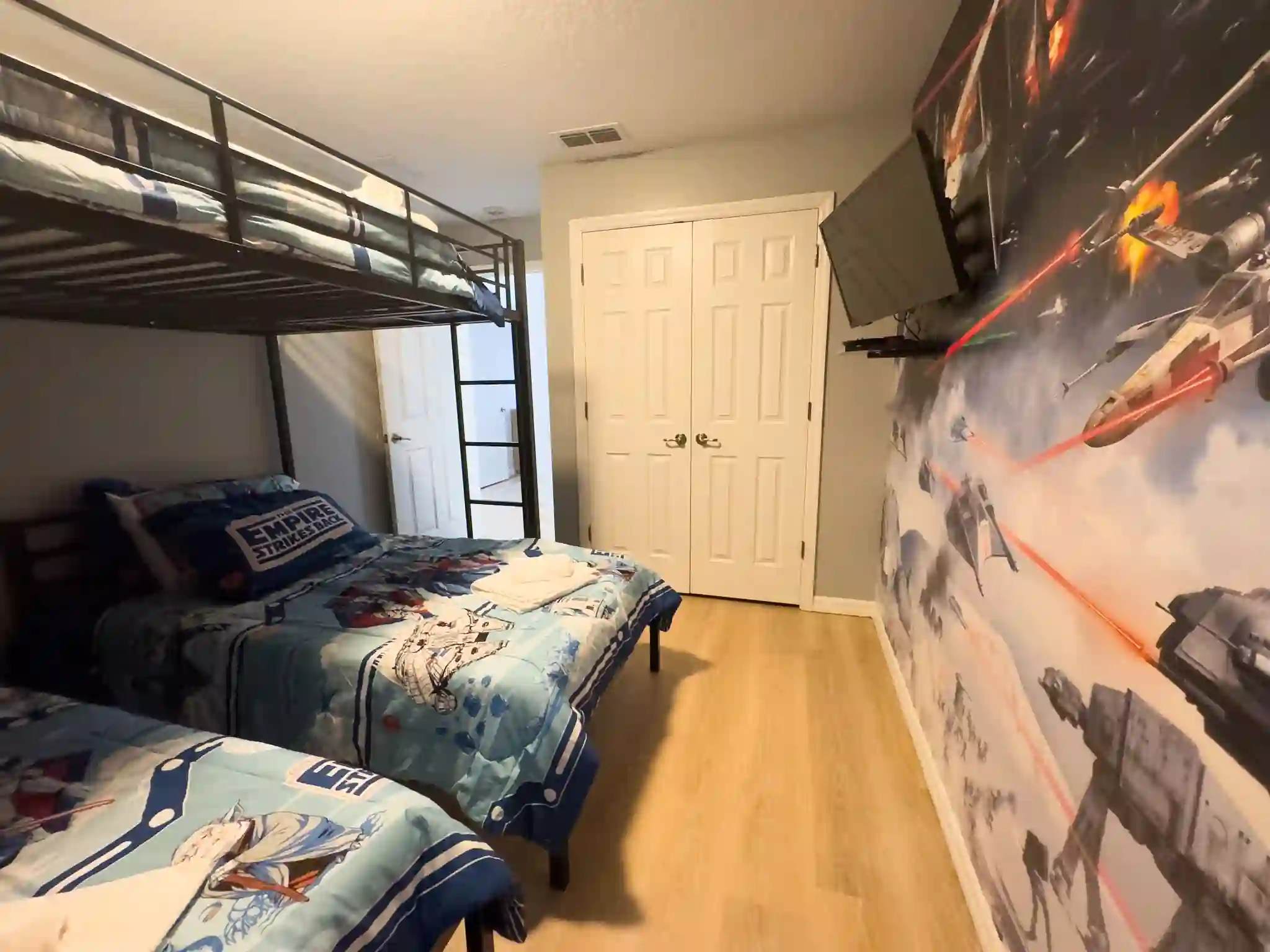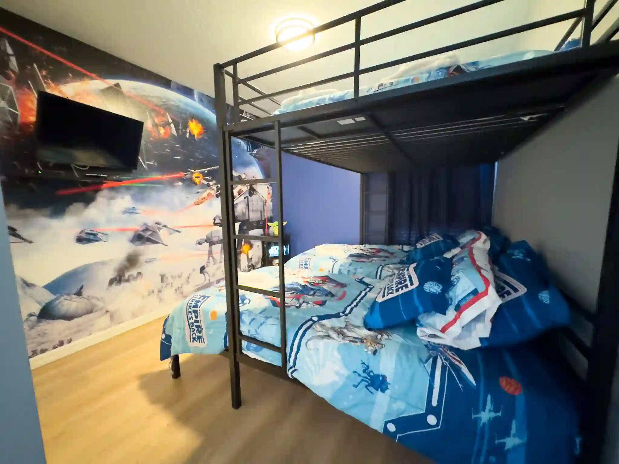 Quarto 01 (Star Wars): Beliche inteligente com 2 camas Twin e 1 cama Full na parte superior.