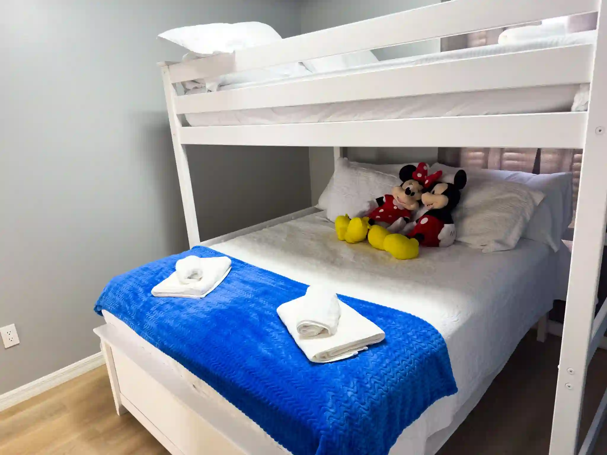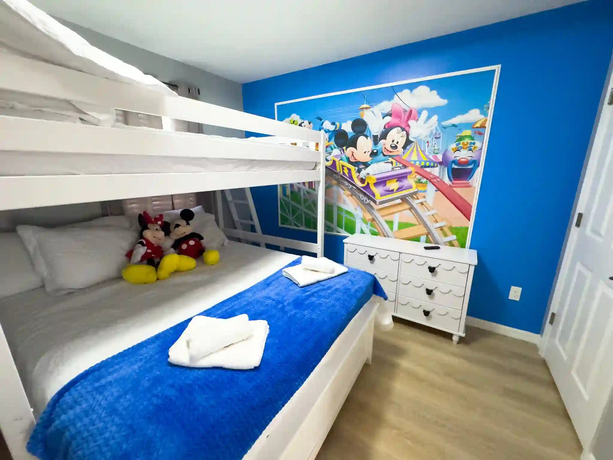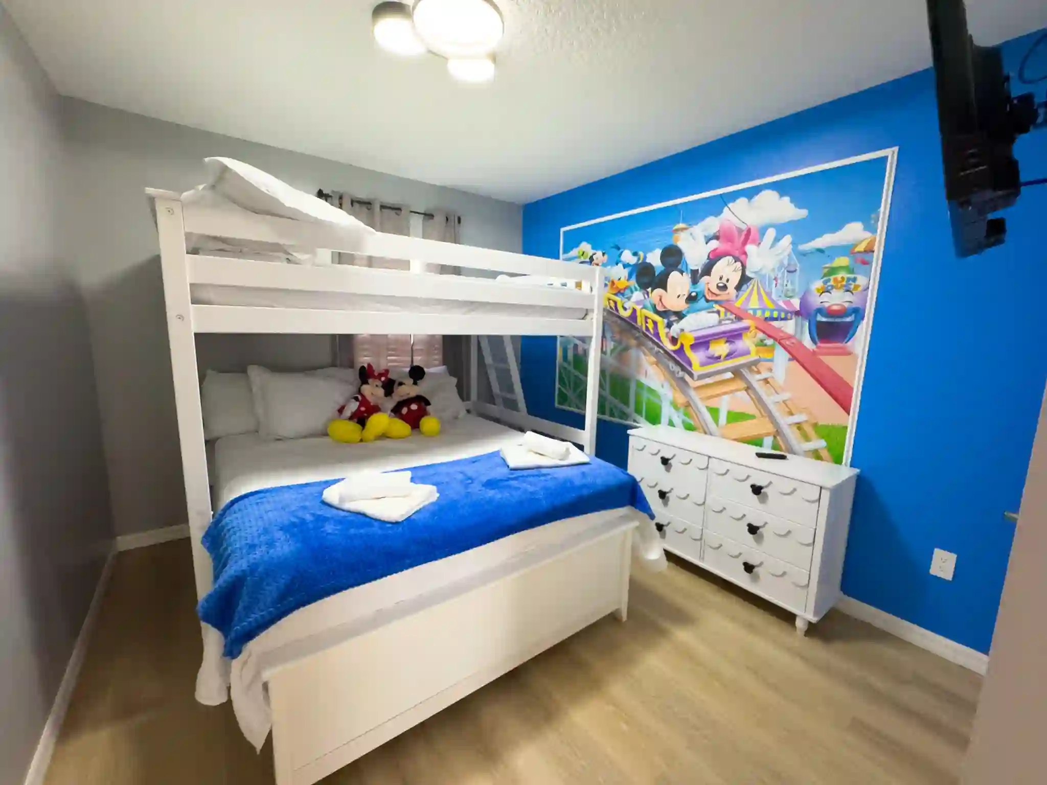 Quarto 02 (Mickey e Minnie): Beliche especial com 1 cama Queen na parte inferior e 1 cama Full na superior.